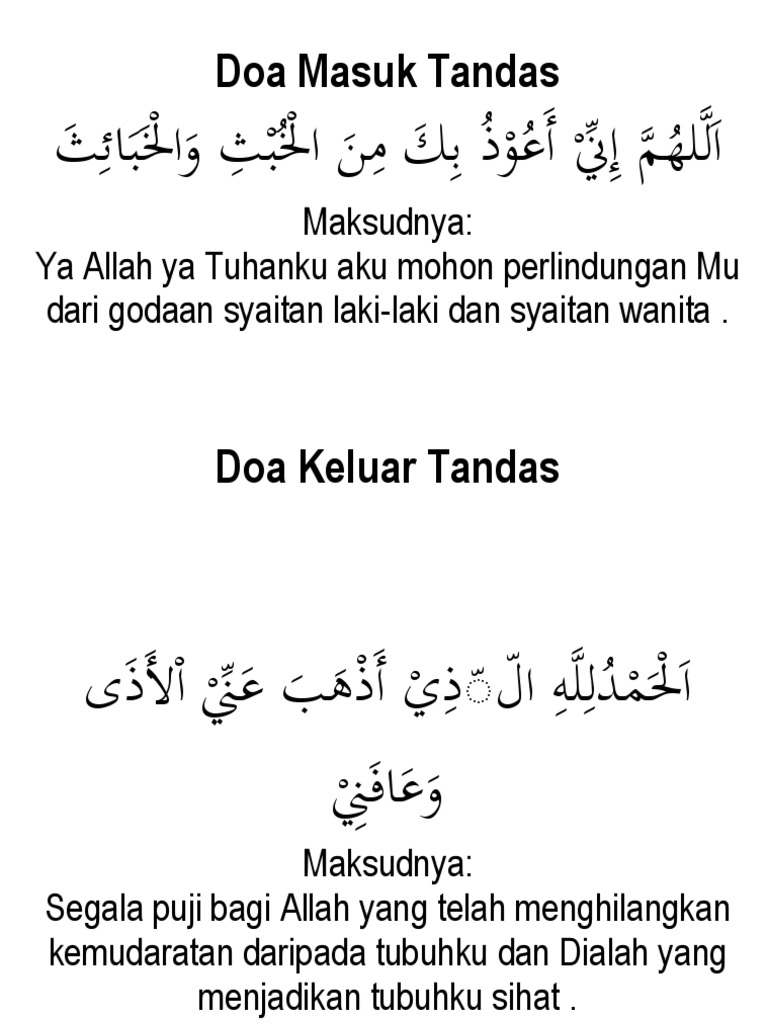 Doa Masuk Tandas dan Keluar Tandas Rumi Jawi Mal Jika anda sedang mencari doa masuk tandas dan keluar tandas kami kongsikan bacaan tersebut dalam rumi dan jawi berserta dengan terjemahan dalam Bahasa Melayu. Sewaktu moreh saya tanya imam ambil mana doa tadi JAKIM ke Majlis Agama ke fikir saya dalam hati. Tapi langsung tak ingat doa keluar tandas.